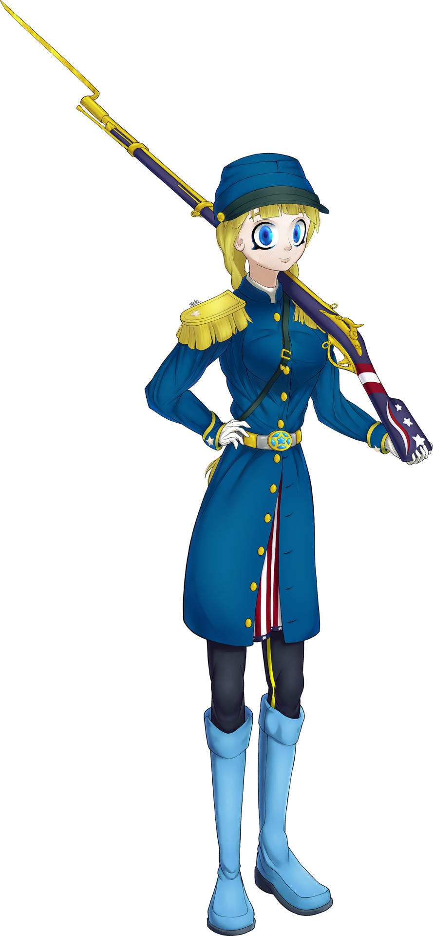 Weapons: A rifle with a bayonet, a derringer, and a Ketchum grenadeA sweet, charming girl from the heart of America.Ulrica Sanford is a magical girl from the rural outskirts of Kansas City, Kansas. She defends the Kansas City area between Kansas and Missouri from the dark forces unseen from everyday life. She is very proud of her family's military history, a tradition ever since her ancestors first landed on the shores of a once unsettled continent. She believes she is doing her part in defending her nation by fighting against the lurking shadows. Besides her career as a magical girl, she helps her family work the fields of their farm.